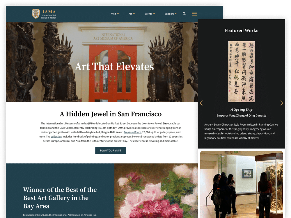 We partnered with the International Art Museum of America (IAMA) to design and develop a website that matches the scale and scope of its international artwork collection. With visitors and artists from around the world, IAMA needed a site that could support global engagement, highlight its vibrant local presence in San Francisco, and offer practical tools for both museum staff and diverse audiences. The result is a multilingual, content-rich platform built to serve art lovers, event attendees, facility renters, and community partners.