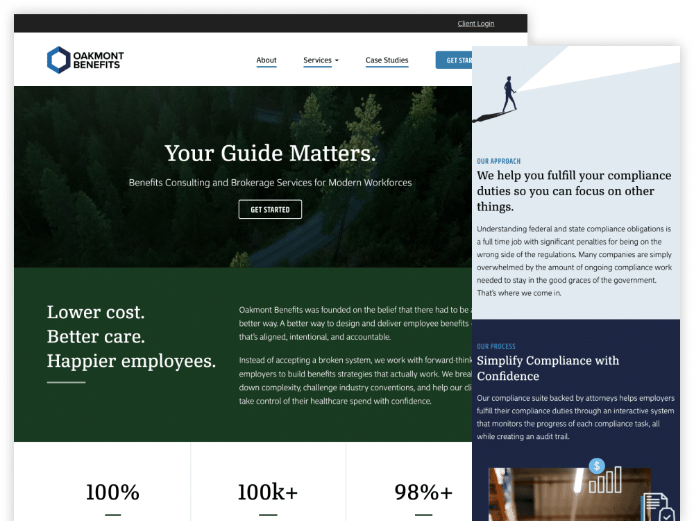 Oakmont Benefits is a boutique employee benefits consulting firm serving mid-market companies. As the business grew from a solo operation to a full team serving larger clients, the website needed to evolve as well. We helped Oakmont present a professional, clear, and credible online presence that reflects Oakmont’s unique model and strategic approach. We created a site that gets straight to the point — just like they do — focusing on helping prospective clients quickly understand how Oakmont does things differently and how that benefits their clients.
