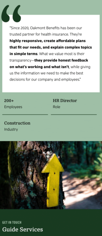To support Oakmont’s bold positioning, we incorporated multiple layers of social proof throughout the site. Case studies highlight real client outcomes, showing how Oakmont’s strategies reduce costs and improve coverage. Key data points, like retention rates, demonstrate client satisfaction and performance. We also included client testimonials to provide third-party validation, offering direct insight into the experience and value Oakmont delivers. These elements work together to build trust and give prospective clients the confidence to take the next step.