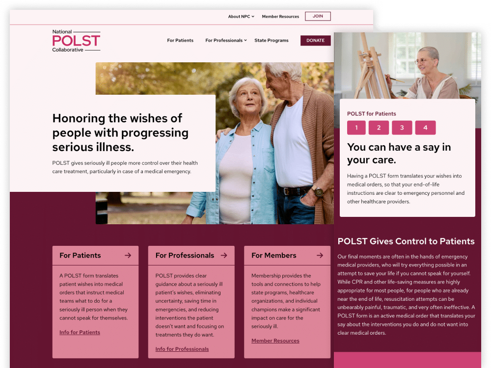Through discovery and strategic planning, we identified a key challenge: too much emphasis on advance care planning language was creating confusion and disengagement. Guided by evidence-based serious illness messaging principles that prioritize choice, benefits, and accessible language, we restructured the site to simplify the user journey and present information in a clear, linear format that keeps visitors oriented. We also elevated membership pathways and national collaboration priorities to align with POLST’s evolving organizational strategy.