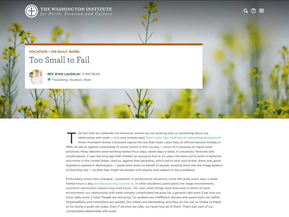 The Washington Institute for Faith, Vocation & Culture shares insightful content from thought leaders on the topics that shape our world. We helped them design and develop a content-driven website that organizes a large volume of long-form articles and educational material while providing a tranquil experience for visitors.
